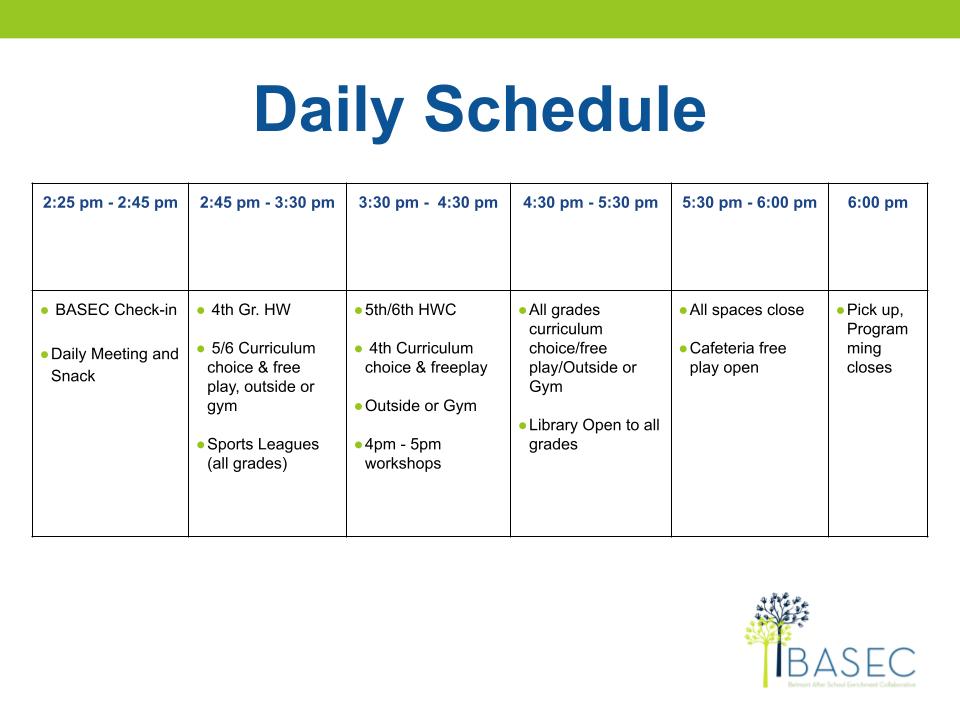 If your child does not check in to after school and we have no prior notification of an absence, we call the parent/guardian phone numbers to confirm absences. On your emergency form (electronically submitted to BASEC’s database), you will notice that we ask for a primary phone contact. Please indicate the best number to reach you and we will call this number first. If there are multiple students absent and multiple phone calls to make, we will call the primary contact number for each student, then resume calling all other numbers on each student’s emergency contact form.